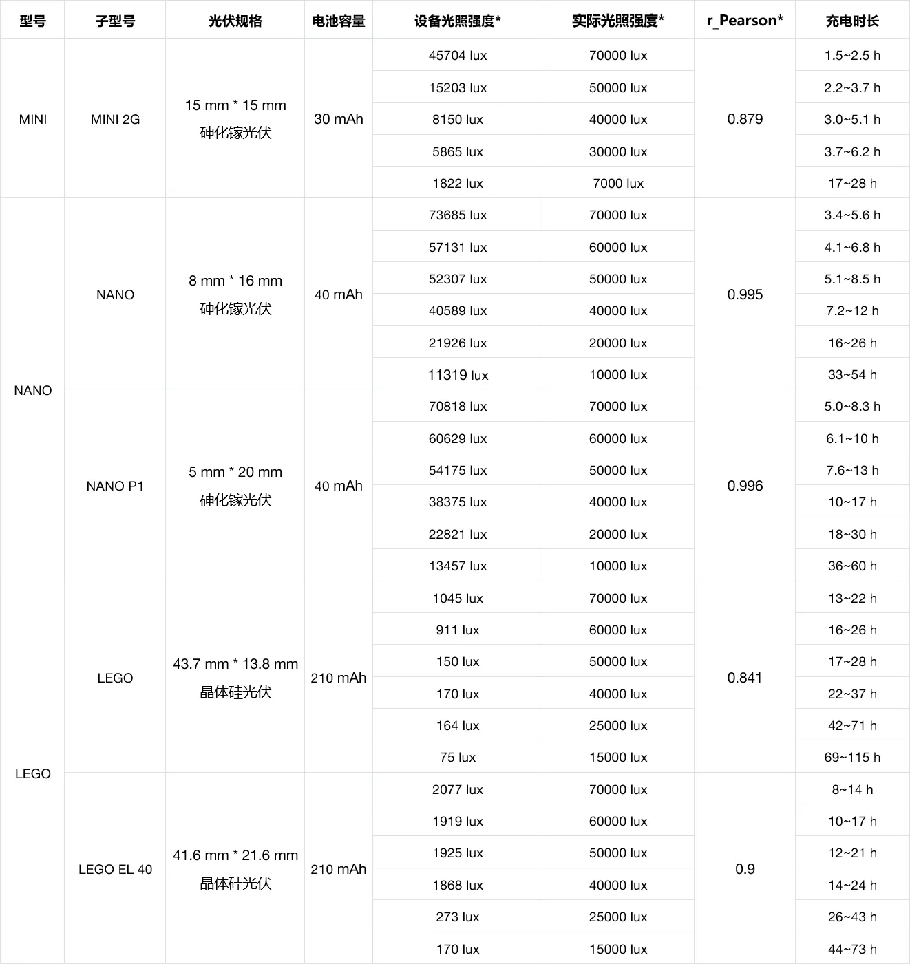- 以上数据是基于自然光线而非人工光源测量得出。测量时,光线与设备太阳能板垂直。