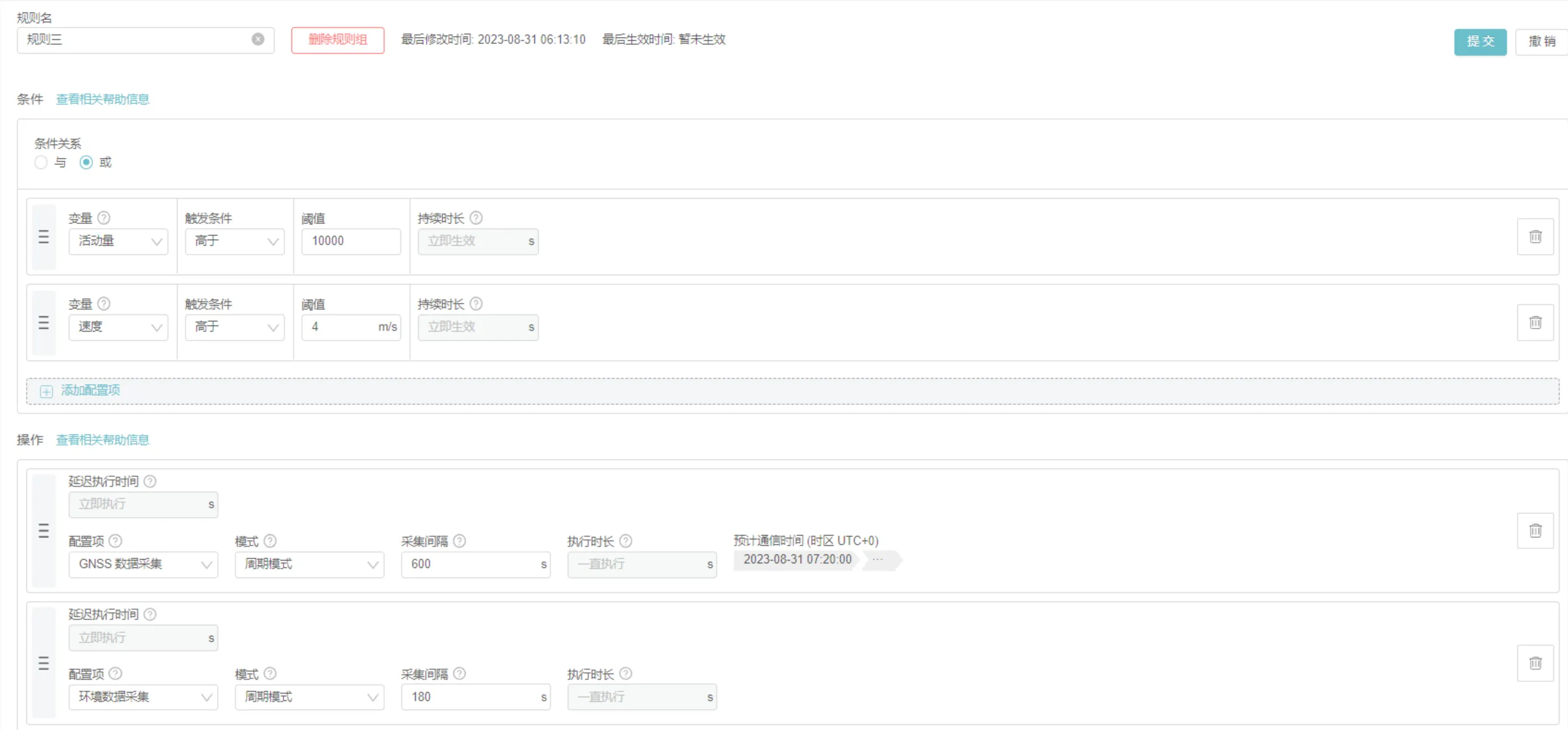 规则组 条件 操作 规则一 与 电压 > 3.9 GNSS 1 小时 ODBA 5 分钟 规则二 与 ODBA > 5,000 电压 > 3.85 GNSS 30 分钟 ODBA 5 分钟 规则三 或 ODBA > 10,000 速度 > 4 m/s GNSS 10 分钟 环境数据 3 分钟