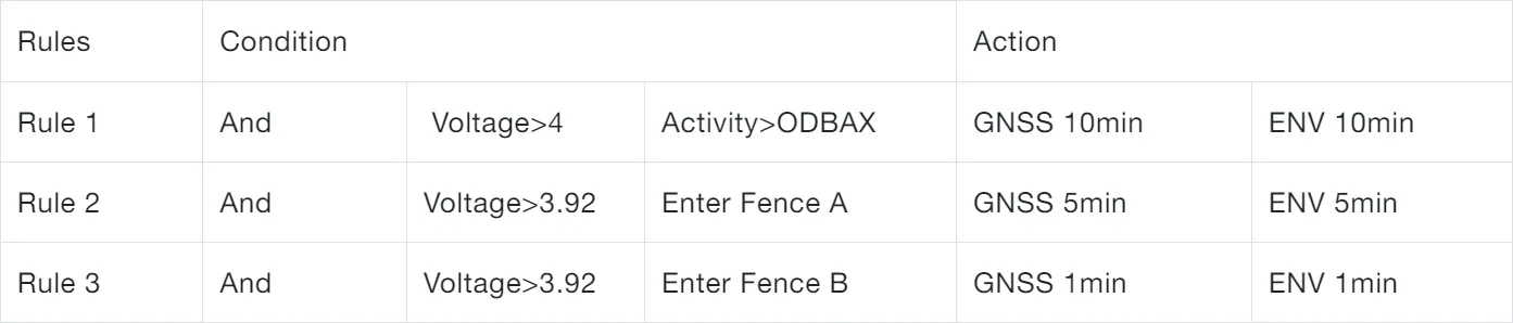 In order to ensure the stability of the tracking device's battery and enable it to work for a long time, the voltage threshold is set relatively high. If the required data period is not long and the research purpose is only to obtain data in the focus area, the voltage threshold can be lowered. The frequency setting for GNSS can be modified but not removed. Other Action items can be added or deleted according to your research purpose.