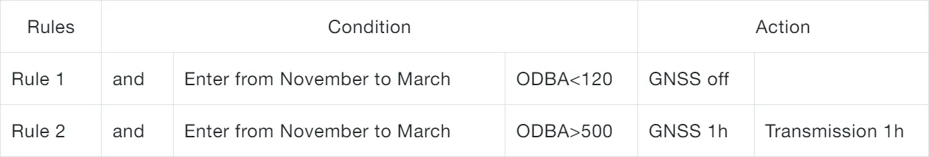Setting strategy: due to satellite signal limitation, GNSS data collected during hibernation is often invalid data, so GNSS collecting is turned off during hibernation to save energy. Meanwhile, the GNSS sampling frequency and transmission interval were increased when the wake is detected by ODBA determining the wake up during hibernation.Basic setting