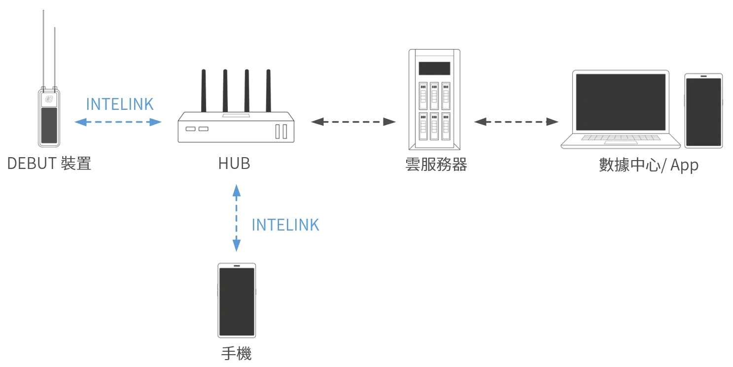 手機可用作 DEBUT 裝置的網關,但通信距離有限。您可以使用 HUB 作為中繼將通信距離延長至 1500 米(取決於實際環境)。
