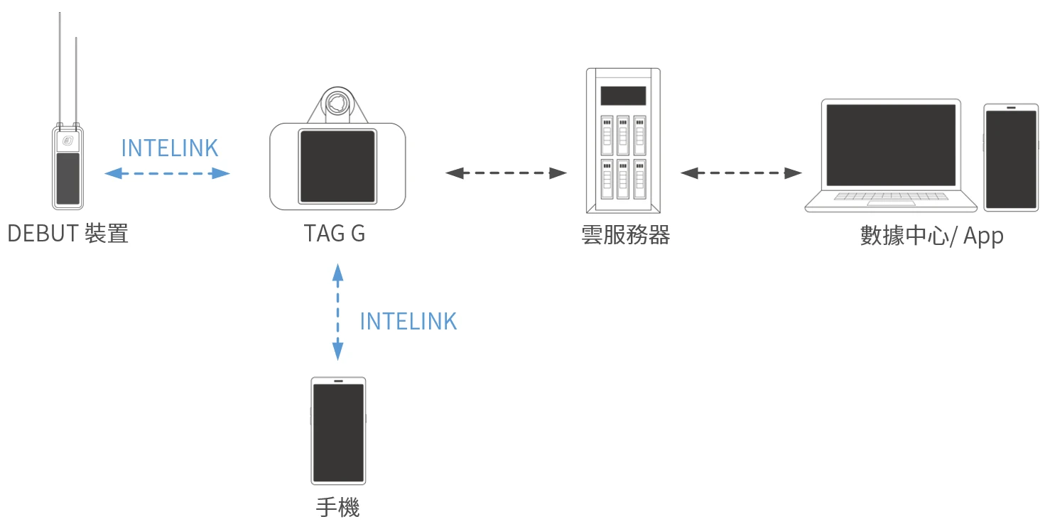 手機可用作 DEBUT 裝置的網關,但通信距離有限。您可以使用 TAG G 作為中繼將通信距離延長至 1500 米(取決於實際環境)。